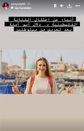 ونشرت سامية عياش صورة المغنية الفلسطينية عبر خاصية "الستوريز" الملحقة بحسابها في "إنستغرام"، مع التعليق: "أنباء عن اعتقال الفلسطينية دلال أبو آمنة بعد تحريض من المستوطنين وهي الآن تخضع للتحقيق".