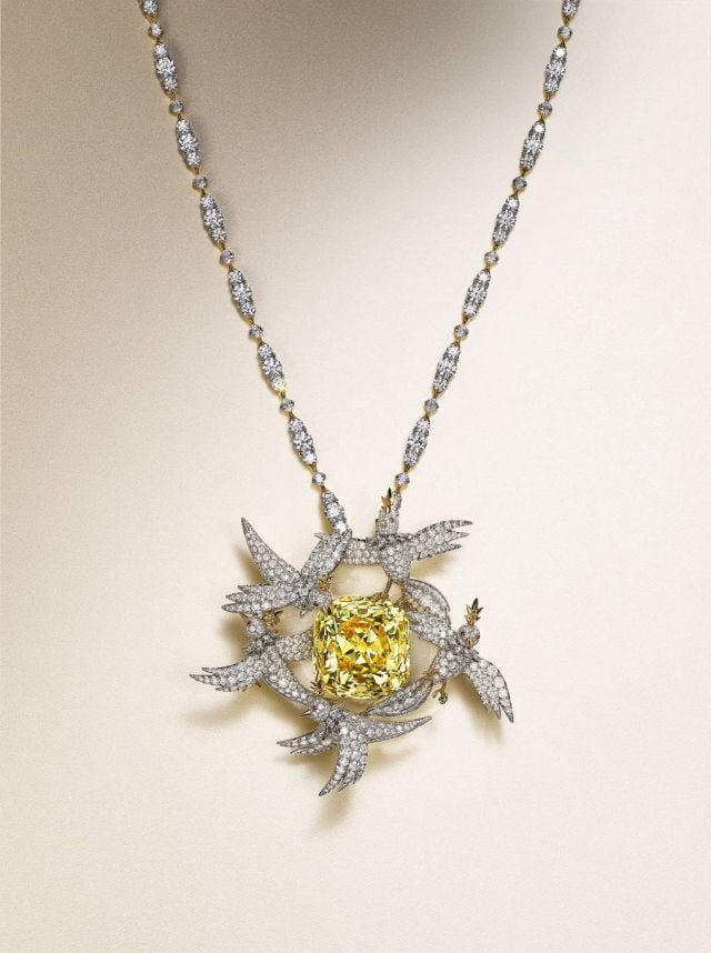 وأطلقت .Tiffany & Co طقماً فاخراً من المجوهرات المرصّعة بالألماس الأبيض خلال شهر نيسان/أبريل، ليضم مجموعة من الخواتم التي يتألق أحدها بتصميم مزيّن بألماسة فاخرة مقصوصة وفق قطع الوسادة بوزنٍ يزيد عن 5 قراريط. وتقدّم الدار قلائد Bird on a Rock الجديدة إلى جانب الأطقم المميزة، والتي تتزين بتصاميم الطائر المرصّع بالألماس فوق نوع من أنواع الأحجار الكريمة للمرة الأولى، ما يسلّط الضوء على جمال الحجر الثمين وألقه. كما تضم التشكيلة مجموعة من القلائد المزيّنة بأحجار من إرث العلامة الشهير، مثل حجر التنزانيت بوزن 31 قيراطاً والكونزيت بوزن 26 قيراطاً، والزمرد الوردي بوزن 23 قيراطاً.