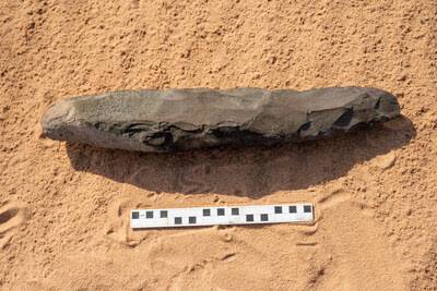 ويبلغ طول الأداة الحجرية المصنوعة من البازلت الناعم 51.3 سم وقد تم حفرها على كلا الجانبين لإنتاج أداة قوية ذات حواف قطع أو تقطيع قابلة للاستخدام، ولا تزال الدراسات تُجرى لمعرفة الدور الذي تُستخدم فيه الفأس اليدوية.