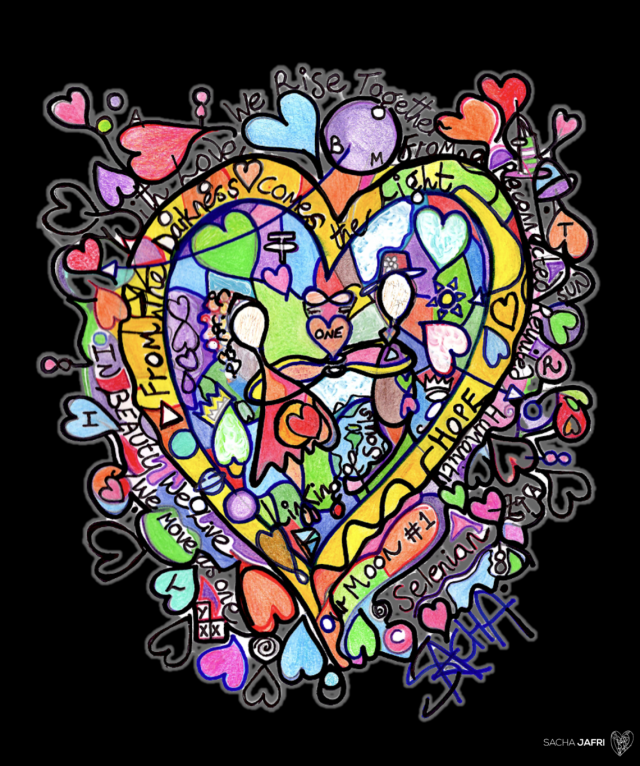 ونقش الفنان قطعته الفنية باستخدام الليزر فوق لوحة مصنوعة من مواد مقاوِمة للظروف المناخية للقمر؛ وهي عبارة عن قلب كبير يحتضن الكثير من القلوب الأصغر حجماً لتصوير إعادة الاتصال بين البشرية، ويظهر في المنتصف رجل وامرأة ممسكَين بأيدي بعضهما البعض تعبيراً عن مشاعر الحب والتعاطف التي تربطهما داخل عالم جديد مزدهر، في إشارة إلى عالمنا كما يجب أن يكون.