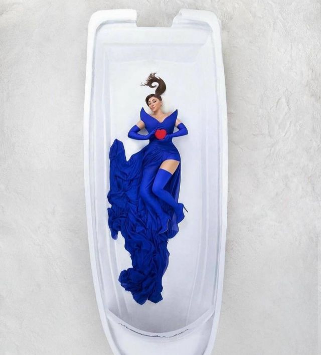 وظهرت النجمة اللبنانية في مقطع مصوّر ترويجي لأغنية جديدة، واختارت الظهور بفستانيّن مختلفين تماماً لناحية التصميم، وتألقت بثوب حمل توقيع المصمّم اللبناني نيكولا جبران من اللون الأزرق النيلي وذي تصميم مميّز عند الصدر، وجاء قصيراً وضيقاً مع صيحة القفّازات الطويلة و"البوط" الطويل الذي يصل إلى أعلى الفخذ من اللون نفسه، وموصولاً بتنورة واسعة عند الخصر.