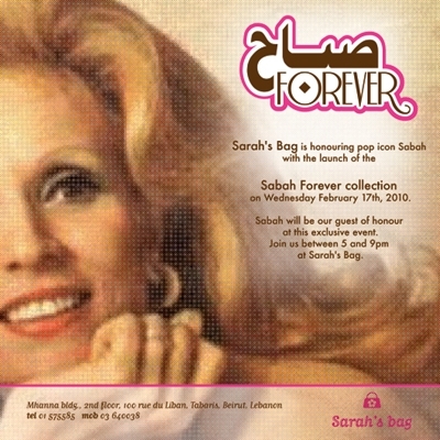 مجموعة من الحقائب اليدوية المطبعة التي تقدم التحية للمطربة العريقة صباح. سيتم إطلاق المجموعة الجديدة في حفل يقام في محترف ساره Sarah's Bag، على أن تحضره النجمة صباح شخصياً مع الإشارة إلى أن الحقائب تعرض صوراً لصباح في أيام العزّ، مع شعرها الأشقر الممتلئ وأناقتها الراقية وفرحها الغامر بالحياة. وتم أخذ الصور من مجموعة الصور الشخصية للفنانة صباح.