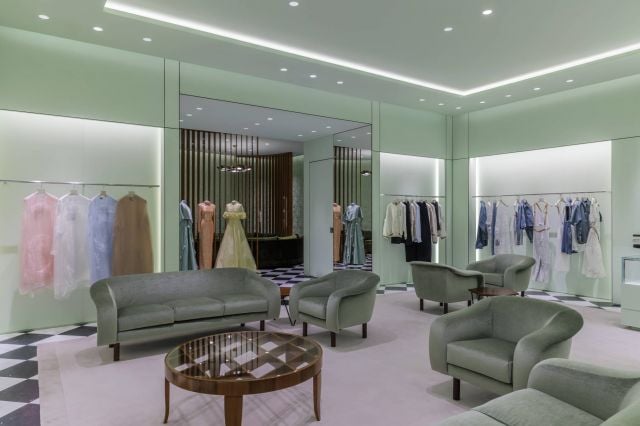 والمتجر الجديد مصمَّم بصالات فسيحة وطاولات خاصة لعرض المنتجات تتخللها سجّادات كبيرة تناسب الأجواء. إضافة إلى مقاعد ناعمة مغطّاة بالمخمل الأخضر وطاولات التقديم وأخرى للقهوة من خشب الورد الفاتح، حيث يتم الترحيب بالعميل في بيئتين خاصتين إضافيتين. وتلفت الزائر أرائك مريحة وزخارف على الجدران ومزيج من عناصر الأثاث المصمّمة خصيصاً لجعل المساحة حصرية.