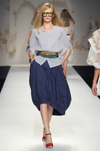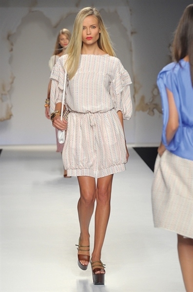 أورغنزا مطبوعة وأقمشة بلون قهوة الكابوتشينو، مع تصاميم بأكمام تطغو عليها الألوان، وقصاّت واسعة وهابطة. في المجموعة الكثير من الشفافية والأبيض مع رسومات صغيرة وتصاميم منقّطة بللونين الأبيض والأسود. وفي المجموعة أيضاً الكثير من الأقمشة المخرّمة والتخريم فيها ملوّن. وقد لفت نظري فستان أزرق وآخر أحمر، بالإضافة إلى لون «الدرّاق». كما ضمّت المجموعة نظّارات شمسيّة باللون الليلكيّ والبنيّ، وحقائب Fendi بألوان الجلد الطبيعيّ من الجلد الروماني الطريّ. أمّا الأحذية فكانت من الخشب أو الجلد المطبوع بألوان حياديّة ولون الزيتون مع لمسات من الألوان الضاربة.
