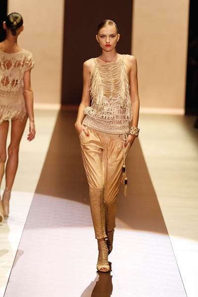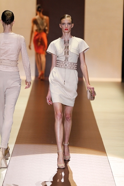 المجموعة ربما استوحتها Frida Giannini من الصحراء ولكنّ المرأة فيها عصريّة، ترتدي التصاميم بأقمشة راقية وتفاصيل بعضها مصنوعة على اليد... المرأة في Gucci مثيرة، تستفزّ من حولها بسخريتها الذكيّة... تختار التصاميم الضيّقة من سترات للرجال أو سترات مثل التي ترتديها لركوب الخيل. التنانير خصرها عال والسراويل واسعة عند الأوراك أو ضيّقة ملتصقة بالجسم. الألوان قويّة، أخضر، برتقاليّ، ليلكيّ، أزرق، كلّها تعكس التفاؤل الذي تشعر به المصممة، تبعتها ألوان حياديّة مثل البيج. كما لعب الأسود دوراً مهماً في المجموعة، مع تركيز على الجلد، فقدّمت تصاميم من الجلد المشغول على اليد بطريقة أنيقة، بعضها أيضاً مع شراريب وأخرى ممزوجة بقطع معدنيّة أو مجدولة.