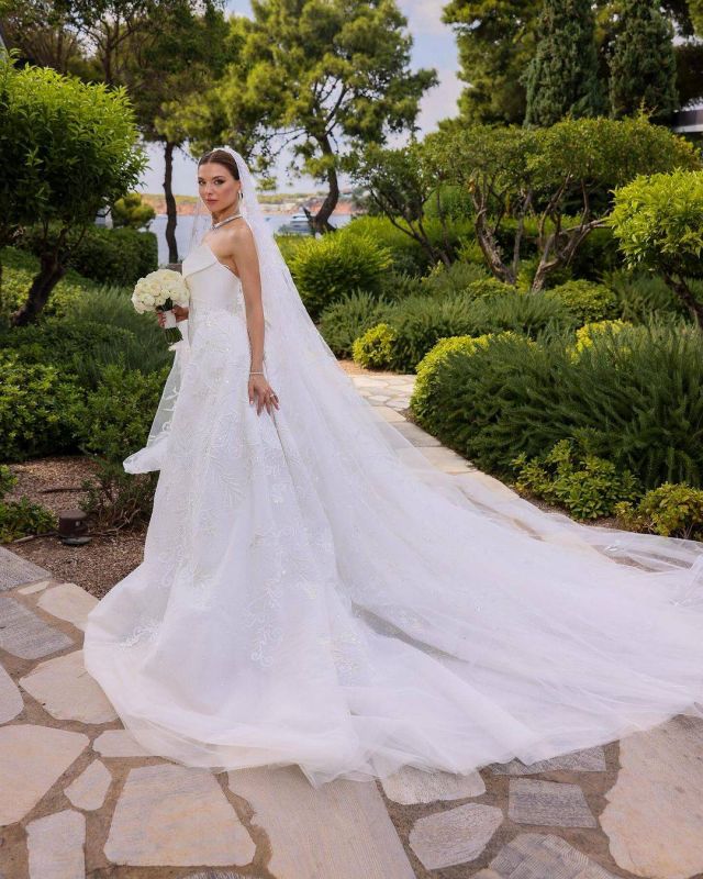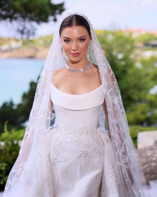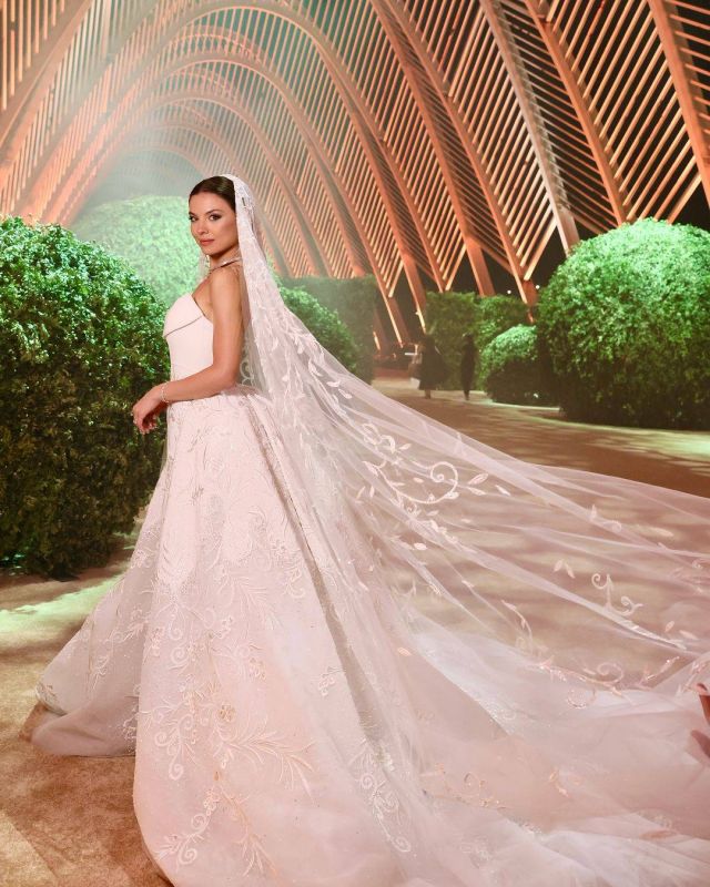 وأكملت العروس إطلالتها الفخمة بطرحة طويلة مزيّنة بتطريزات ناعمة مستوحاة من الطبيعة لتتناغم مع تصميم الفستان الفخم الذي استغرق تحضيره 714 ساعة من العمل المُتقن. وأكملت مايا إطلالتها بطقم مميّز من الذهب الأبيض المرصّع بالحبيبات الماسية.