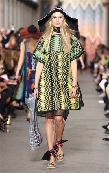 في عرض Missoni الكثير من الألوان طبعاً تعكس الحيويّة، باتشوورك ورسوم غرافيكيّة، تطريز ومطبوعات. المجموعة ضمّت تنانير طويلة تصل إلى الكاحل، مع قمصان قصيرة، سراويل قصيرة وأخرى عاديّة، سترات طويلة مع أو دون أكمام. تصاميم بأكتاف عريضة، مربّعات، مثلّثات، دوائر ومستطيلات ملوّنة أضافتها المصمّمة Angela Missoni إلى أزيائها، على الصدر؛ أقمشة محبوكة تخبئ بعض الجمل والكلمات، وقبّعات كبيرة شبة آسيوية، مناديل بألوان مختلفة مربوطة على الرأس.