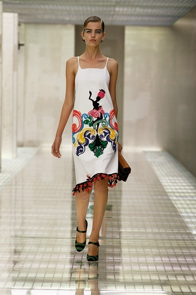 خطوط ملوّنة، موز وقرود... بدأت Miuccia Prada عرضها بتايورات شبيهة بملابس المساجين والأطبّاء بألوان البرتقاليّ والأخضر والأزرق. ثمّ أضافت الخطوط الأفقيّة إلى أقمشتها، خطوط ملوّنة أيضاً تبرز الموز المطبوع على الأقمشة والقرود! التنانير والفساتين ضيّقة تصل إلى تحت «الركبة»، قصّتها أحياناً بطريقة غير متساوية. الخطوط والمربّعات أتت حتّى على الأحذية بكعوبها الغريبة.