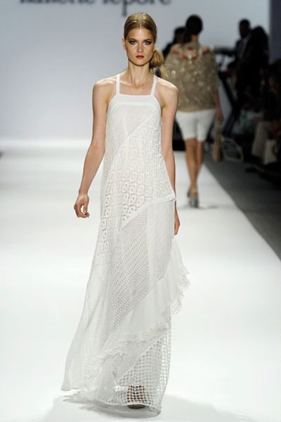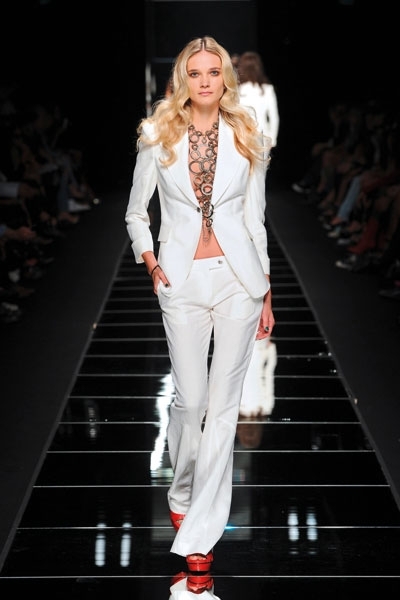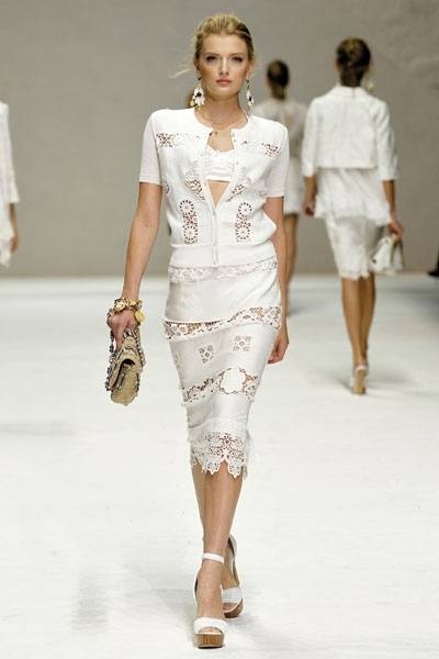 مجموعة Dolce & Gabbanna هذا الموسم أتت أغلبيّتها باللون الأبيض، وبأقمشة مختلفة. الأبيض رأيناه في كلّ مكان، شفّاف، بقصّات مميّزة مثل Versace، طويل مع ثنيات مثل عرض J.Mendel، طويل ومخرّم مثل «الكروشيه» كما في Nanette Lepore، مع حزام عريض ملوّن مثل رالف لورين، أو بسحّابات ذهبيّة مثل عرض Blumarine... لم لا تختارين بذلة بيضاء مثل الرجال كما في عرض Richmond، فستاناً قصيراً وواسعاً كما في krizia، أو بغاية الأناقة كما في Carolina Herrera و Chado Ralph Rucci، وأخيراً بذلة مشكوكة للسهرة كما قدّمها المصمّم جورج شقرا في Edition.
