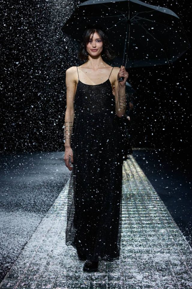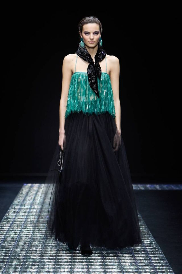 إحساس لونيّ يتمّ التقاطه وترجمته إلى شكل أو حركة انسيابية سهلة أو وميض ضوئي: هكذا وُلدت مجموعة "إمبوريو أرماني" emporio armani هذه، تكريماً لسماء الليل المضيئة، التي تزيّنها النجوم وحاكمها القمر الساطع. تتميّز لوحة الألوان بأنها باردة إنما حيوية: يهيمن اللون الأسود، جنباً إلى جنب وميض ظلال من اللون البنفسجي، الـ "ألترا ڤيوليت"، اليشم الأخضر، واللون الرمادي، والذي يلوّن سحر سماء الشتاء وقت المغيب. صباح الخير، مساء الخير! في هذا السيناريو الآسر، تتغاوى امرأة armani المثالية بحرّية emporio الغريزية المتأصلة: ترتدي بنطلوناً تحت فستان منتفخ يشكل في نظرها قميصاً فضفاضاً، وتعيد اكتشاف المعاطف بأشكالها الواسعة المُغلّفة، تتألق بصداري من القماش أو الكروشيه؛ ترتدي الـjumpsuits وسراويل فضفاضة تصبح أضيق عند الأسفل. الألوان الداكنة جاءت بمثابة دعوة للتلاعب بالأنسجة: قماش مشمّع لامع، صوف مغسول غير لامع، صوف مُدمج لامع، ثم ثلاثية الأبعاد لأقمشة الجاكار وأنسجة من الفرو الاصطناعي متعدّد الألوان. الصورة الظلّية لملابس مغلّفة ذات أكتاف بارزة. تتوَّج الرحلة في المساء بوميض توهج انعكاسات معدنية، نجوم وأقمار مطرّزة، وسلاسل مصنوعة من حجر الراين. ترافق دوامة الـ "ستار دست" النجمية هذه أحذية مسطّحة، وحقائب إما كبيرة وواسعة أو صغيرة الحجم، ومجوهرات كلمسات زخرفيّة خفيفة، وأزهار ليلية طويلة تمّ تثبيتها على طيّة صدر السترة.