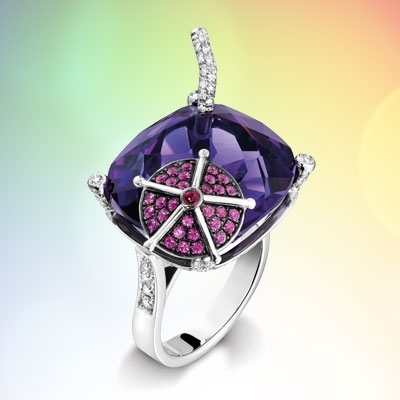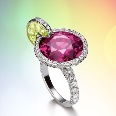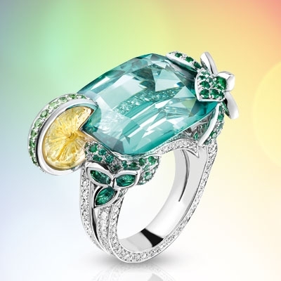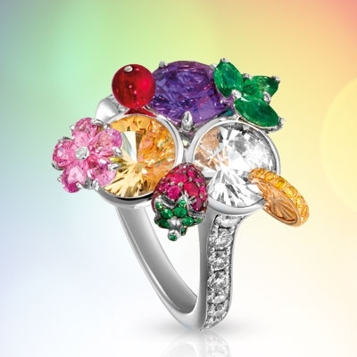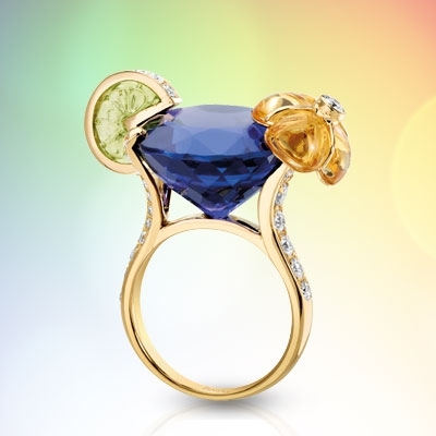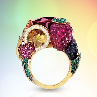 هذه الخواتم الشبيهة بثمار الفاكهة المميزة والغنية تتلألأ بالألوان مع ترصيعها بأحجار مومضة شبه شفّافة بأسلوب ساحر يوحي بالإنتعاش.