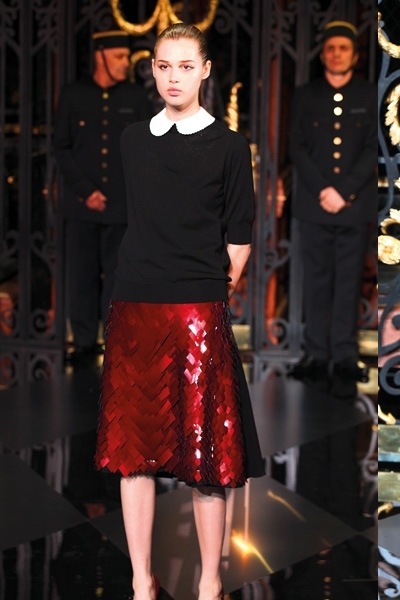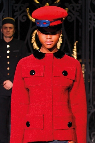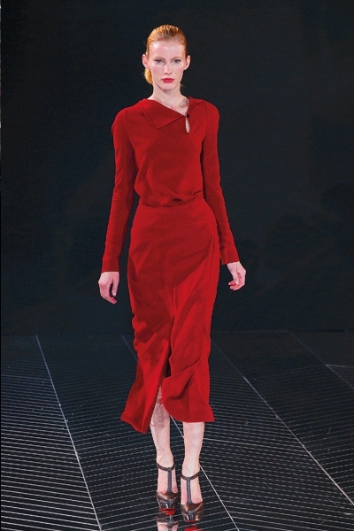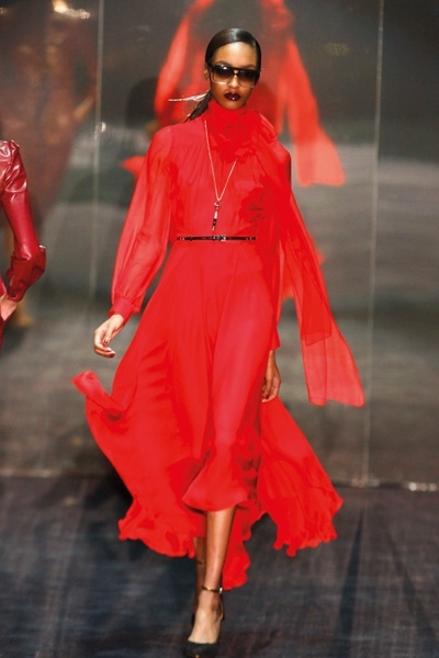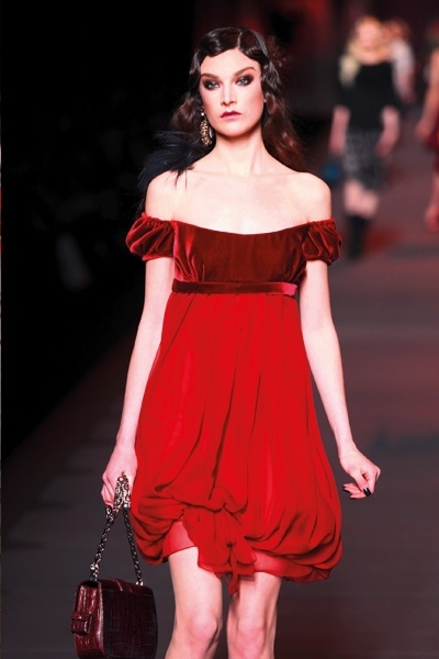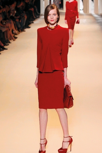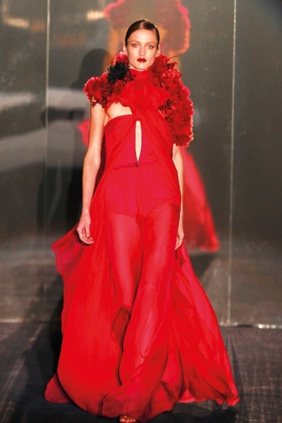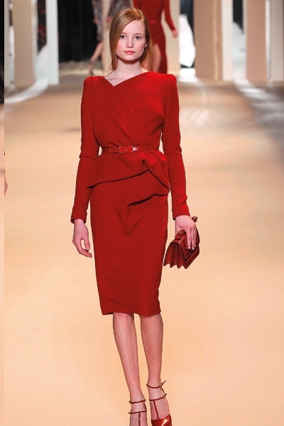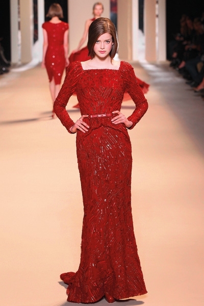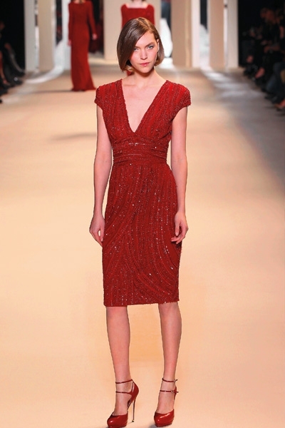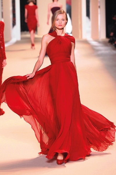تطاير الشيفون، سطع الترتر ورفلت الفرنسية الراقية، لا حاجة هنا إلى بساط أحمر. فببساطة لا مجال لأحمر إضافي يضاهي تدرجي البرغندي والقرمزي اللذين أغدق المصمم إيلي صعب اعتمادهما في مجموعته هذا الموسم. رصّع صعب الأحمر بالأحزمة والترتر دون توحيد التصاميم، القصات المنفرجة والمسترسلة والمستقيمة والمثنيّة بخفة وخفاء، لون يحتبس كل الحرارة اللازمة هذا الموسم. وفكرة أدركتها أخيراً هي سطوة الأحمر وسلطته على «الغير» الدخيل، ولو حتى بربطة عنق خلال لقاء عمل. هذا ما عكسه أحمر دار لوي فويتون عبر الحقيبة والقفازين والجزمة والقبعة العسكرية البرغندية والعنّابية. فماذا لو أطلق عليك صاحبة الرداء الجلدي الأحمر؟... لن تخلّفي براءة «ليلى ذات الرداء الأحمر» بالتأكيد.