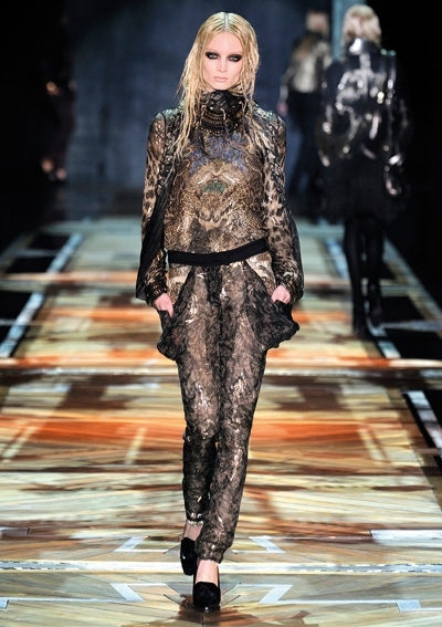 التصاميم كما تقول زوجة Cavalli في الكواليس عبارة عن درع يحمي المرأة، لكن من الداخل. بوهيميّة محاربة بتصاميم مشكوكة بكثافة فوقها قمصان خفيفة شفّافة مطبوعة. عمل يدوي دقيق على أقمشة «كريب دو شين». ريش خفيف وطبيعيّ. فرو بقصّات صغيرة يجاري جسم المرأة... المجموعة لا توصف بكلمات بل يجب أن تراها العين!