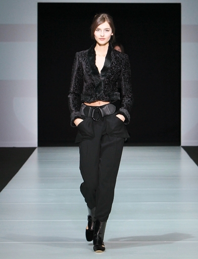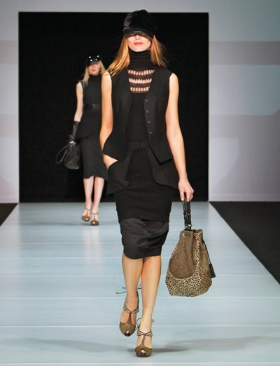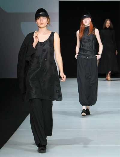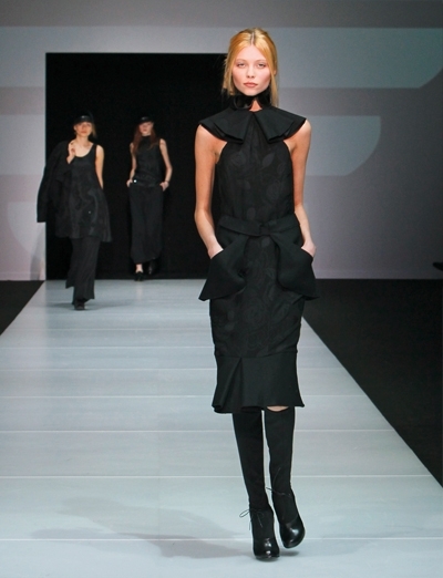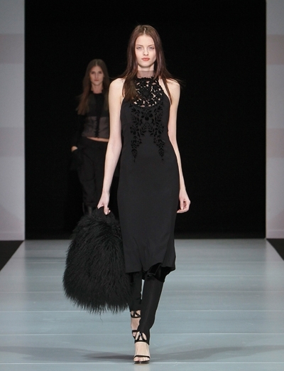 في العرض لمسات وحيدة وقليلة من لوني الأخضر والأزرق: 3 سترات من الفرو وبعض الحقائب والأحذية. ولكن الأسود هو لون المجموعة بكاملها، بمختلف أنواع الأقمشة، من موهير وجوخ وجلد ومخمل أو أسود برّاق مشكوك.