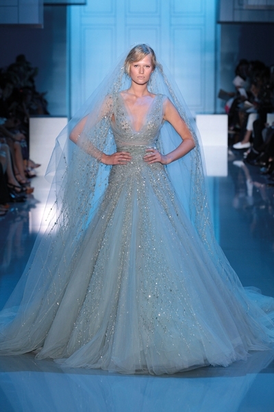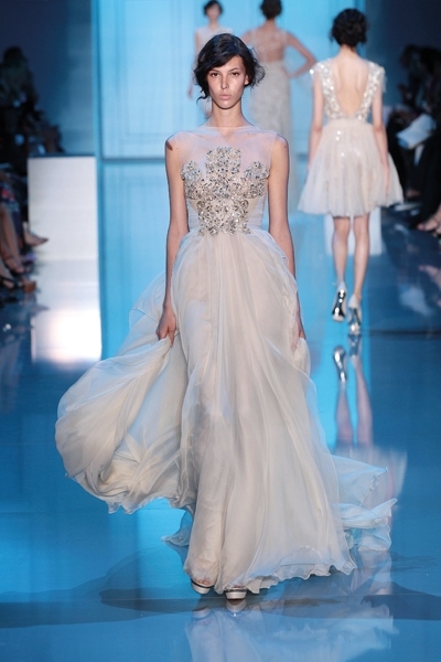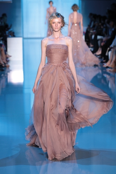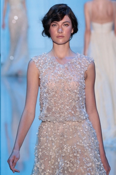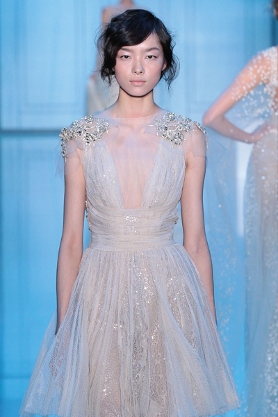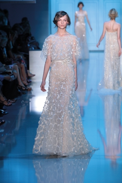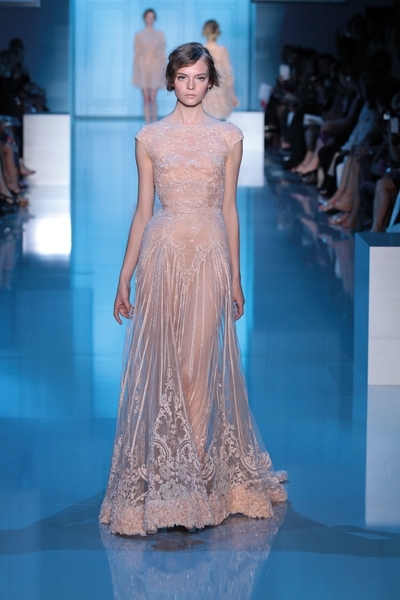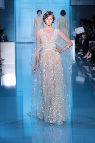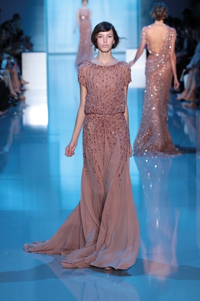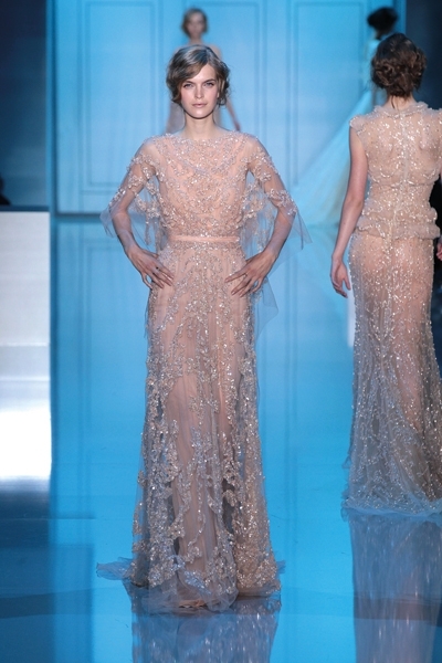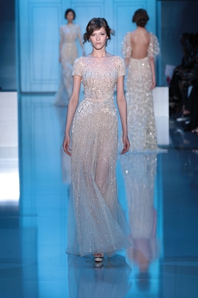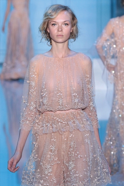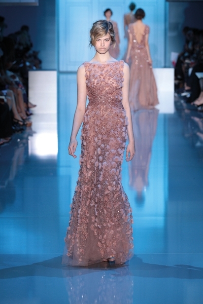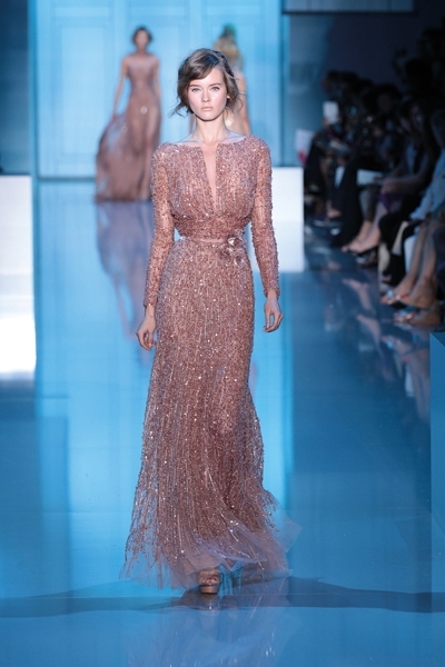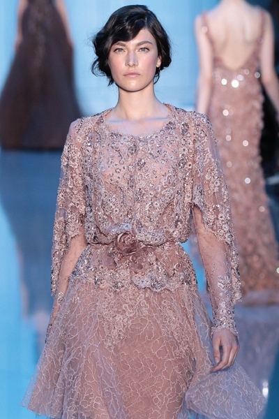 امرأة من بريق تتسلّط عليها الأضواء، فتشعّ أكثر، هي امرأة المصمم العالمي إيلي صعب الإستثنائية. ابتعد صعب عن التصاميم الكامدة ليدخل بخيال في تفاصيل الخياطة المرصّعة بالترتر وأحجار الكريستال التي تألقت على الفساتين الزهرية المعتّقة والمحايدة والبيضاء الثلجية وسطعت كوميض الألماس. ابتعد إيلي صعب أيضاً في مجموعته هذا الموسم عن القصات اللصوقة تصميماً، معتمداً خطوط الفراشة على مستوى الكتفين وانسدال ستائر التول والأورغانزا التي انسابت بعدما طُوقّت بحزام مشبوك بزهرة من لون الفستان نفسه. تطريز إنكليزي راقٍ وترصيع رومانسي متفائل تتهافت عليهما هوليوود بزخم، فهما إهداء إلى البساط الأحمر... هذا ما تستدعيه كل فتاة في أحلامها الأنيقة غير الحادّة. استغني حتماً عن أي قطعة مجوهرات إن رفلت بأحد فساتين هذا المجموعة.