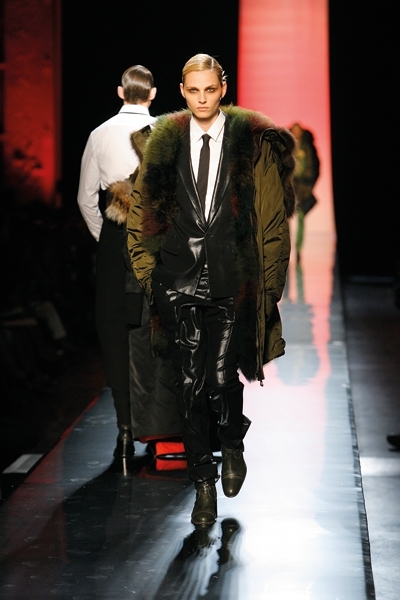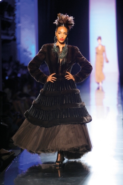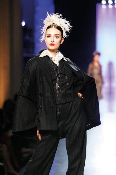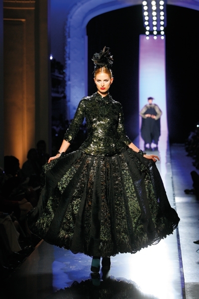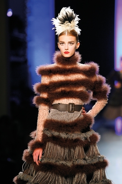 استوائية وغجرية وأرستقراطية، هي راقصة الباليه التي استلهم منها المصمّم الفرنسي جان بول غوتييه تصاميمه من عوالم مختلفة توافقت على الإتساع وأحذية الباليرينا الساتينية، فيما طبع ريش النعامة والتول والشيفون والفرو والكشمير استعراض الفانتازيا المتباين بطول متباين أيضاً. وحتى ضيفة شرف المصمّم المغنية الفرنسية ميلين فارمر التزمت بعنوان العرض الأبرز حين رفلت على المنصة بثوب الباليه الجلدي الأسود. منتهى الأنوثة قابلتها الإطلالة الذكورية التي حضرت بقوة مع البزة الرجالية pin-striped المخطّطة والجلدية والسترة المزدوجة التزرير، ولكن ريش الشينيون منح حدّة حضور "أوزات البحيرة" ملامح أنثوية .
