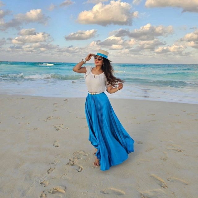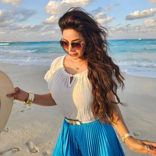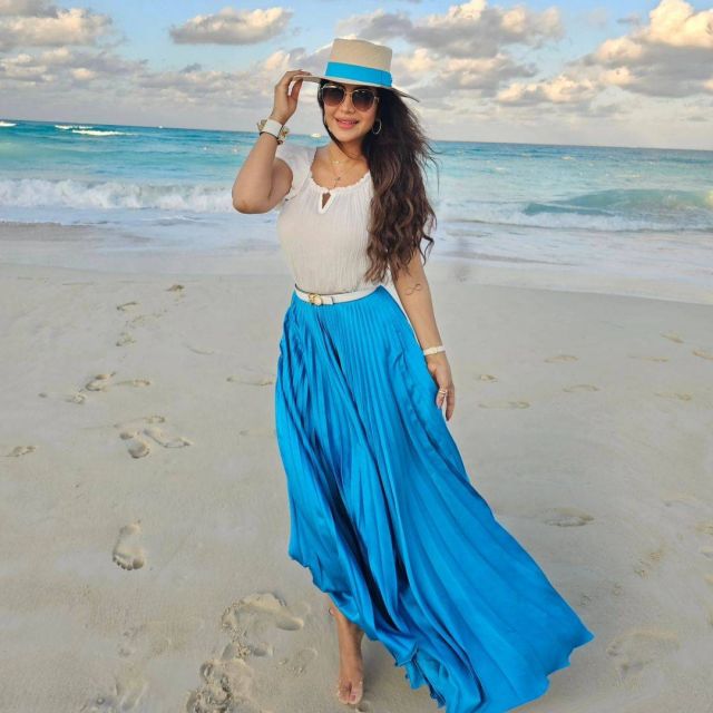 دائماً ما تعرف لجين كيف تنسق أزيائها بما يتناسب مع المكان، وفي هذا الظهور، اختارت بلوزة بيضاء مصنوعة من القطن الخفيف، وهو قماش مثالي للأجواء الحارة. وقد نسقت معها تنورة ساتان زرقاء فاتحة تتسم بالثنيات الجميلة، مما يعكس أحدث صيحات الموسم. لإبراز خصرها، استخدمت حزاماً رفيعاً باللون الأبيض، مما أضفى لمسة أنيقة على الإطلالة.