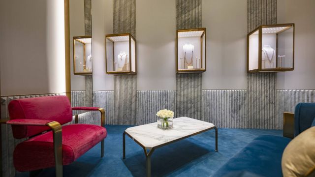 وقد شكّلت هاتان البيئتان المميزتان جزءاً أساسياً من الحلّة الجديدة للبوتيك الرئيسي، الذي أصبح يمتد على 90 متراً مربعاً. ولدى وصول الزوار إلى البوتيك، تستقبلهم على الفور شاشة رقمية تفاعلية تعرض مجموعات المجوهرات الأيقونية للعلامة، وفي الجهة المقابلة، يتم تزيين الخزائن الزجاجية والنحاسية بقواعد رخامية فخمة، ما يجذب الزوّار لاستكشاف قطع المجوهرات المعروضة من الذهب عيار 18 قيراطاً المرصّعة بالألماس والأحجار الكريمة.