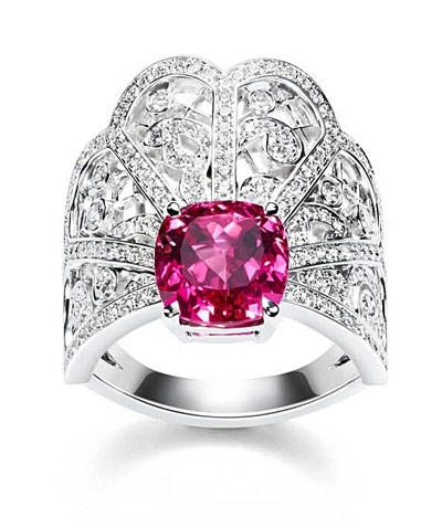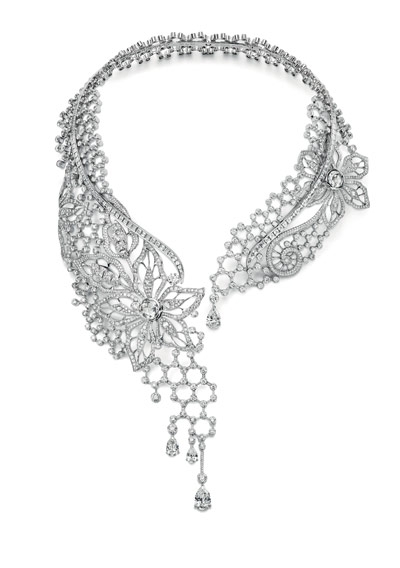 قلادات مستوحاة من التخريم تنساب بانحناءات أنثويّة رائعة مرصّعة بالماس والاحجار الكريمة وساعات تحمل تفاصيل دقيقة مرصّعة بماسات تحاكي القماش فيها وتنحت المعصم كما ينحت الزيّ الراقي الخصر.