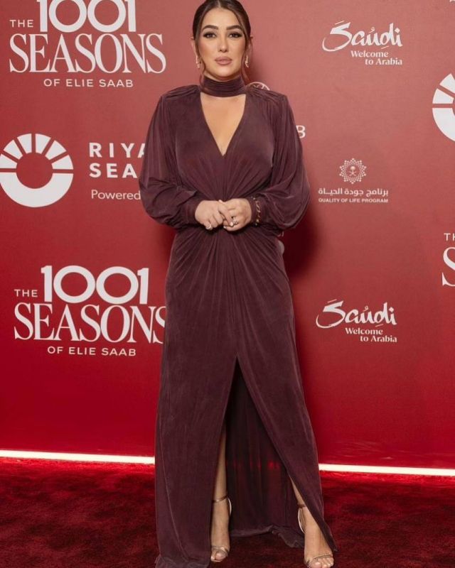 وفي وقت سابق، حضرت النجمة السورية في العرض الخاص الذي اقيم ضمن موسم الرياض للمصمم اللبناني العالمي ايلي صعب، وحضرت بفستان مخمل فخم بدرجات النبيذي الغامق، بتصميم محتشم وأنيق بقصّة مجسمة تبرز رشاقتها مع فتحة رقيقة من الوسط، وتزينت ببعض المجوهرات البسيطة.