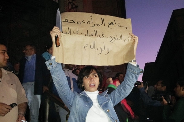 مشهد لفتاة مصرية بسيطة تحمل سكيناً ضخمة إلى جانب لافتة كتبت عليها «المرأة هتاخد حقها»، يلفت الانتباه إلى شخصية جريئة لم تكتف بحمل سلاح بسيط دفاعاً عن نفسها، بل تسلحّت بسكين مخيفة تقف ملوحة بها لكل من يجرؤ على الاقتراب.