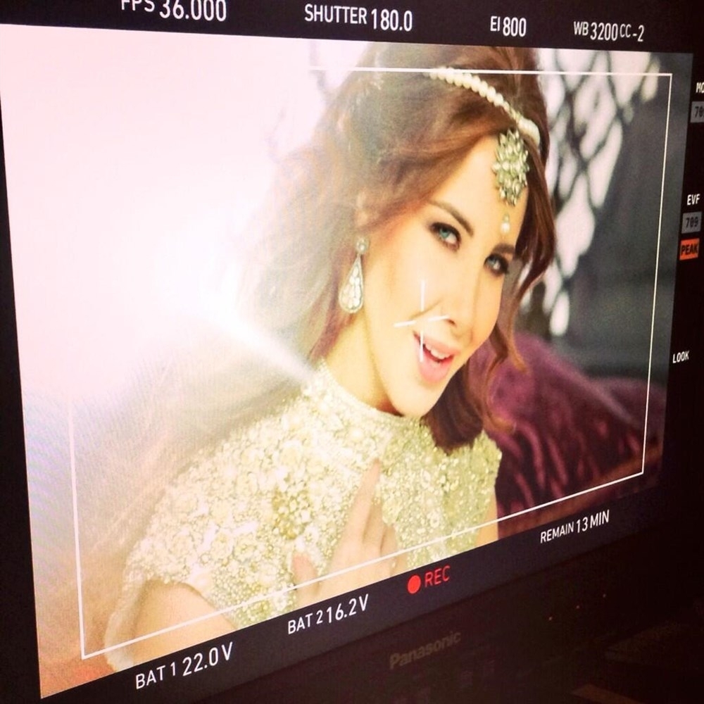 نشرت النجمة اللبنانية نانسي عجرم صورها على موقع تويتر خلال تصوير فيديو كليبها الجديد مرتدية فستاناً أبيض اللون قالت إنه من تصميم دار دولتشي أند غابانا.