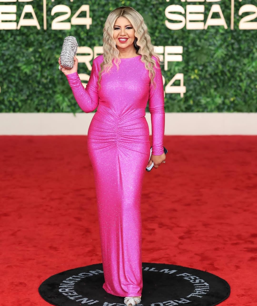 ارتدت الإعلامية بوسي شلبي فستاناً لامعاً باللون الفوشيا، تميز بتصميمه المجسّم الذي يبرز رشاقتها، حيث جاء طويلاً وضيّقاً مع أكمام طويلة، ونسّقته مع حذاء فضّي مع حقيبة "كلاتش" فضّية ناعمة، مما أضفى لمسة من الرقي والجاذبية على إطلالتها.