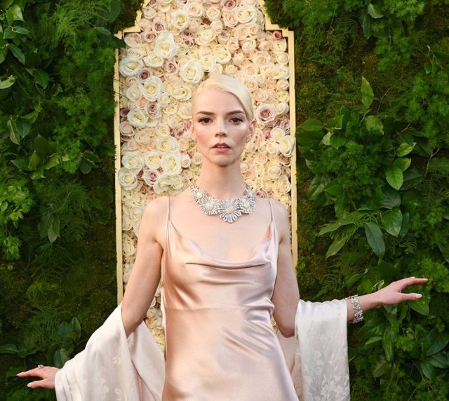 بينما ارتدت أنيا تايلور-جوي فستاناً من الحرير البسيط، أضافت المجوهرات اللامعة من تيفاني أند كو. المكوّنة من الألماس والأوبال لمسة من الفخامة.