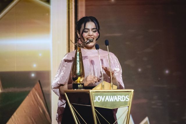 فنانة شابة تبكي متأثرة بعد حصولها على جائزة في Joy Awards