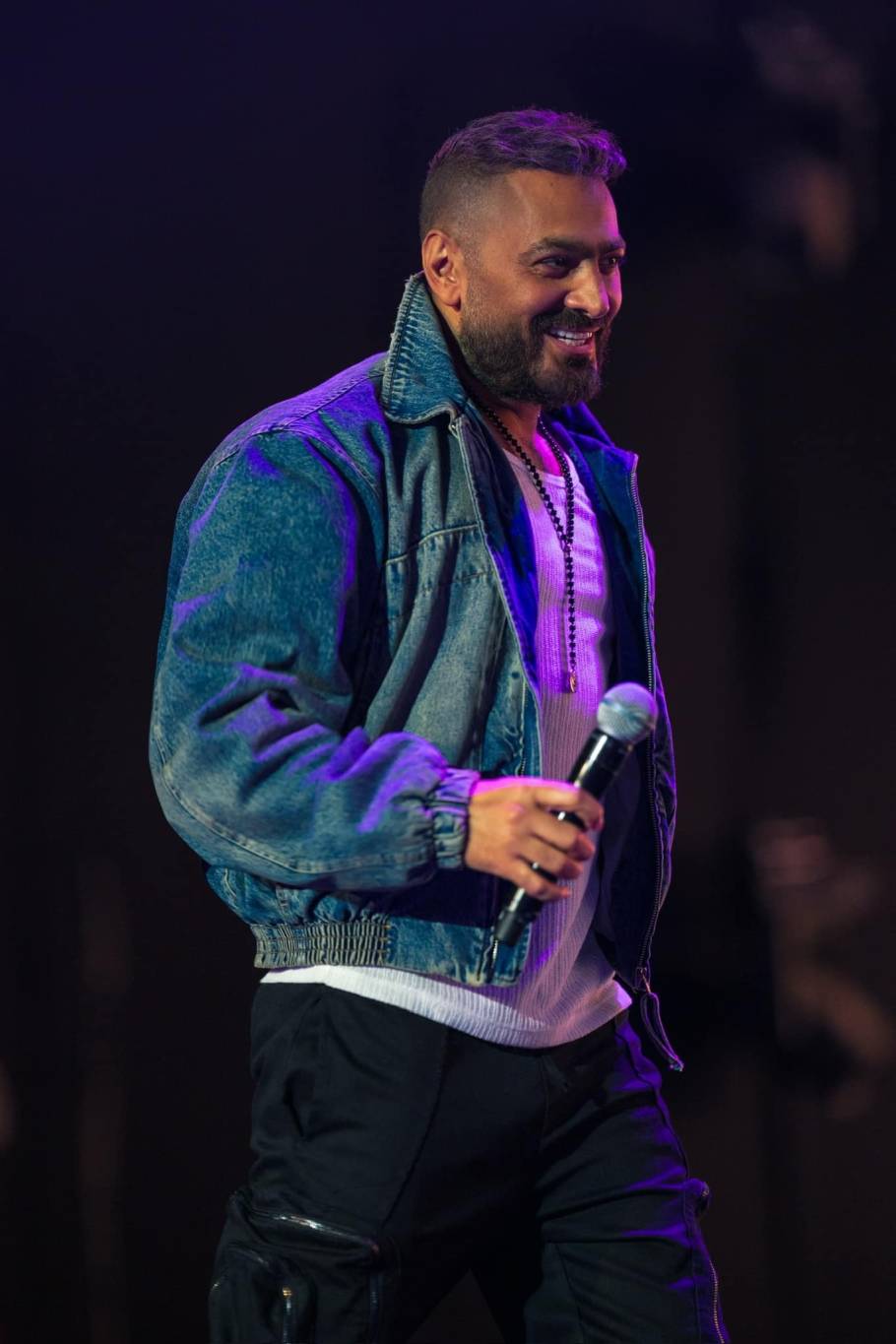 وقدّم تامر في الحفل استعراضاً مبدعاً جمعه بالنجمة نيللي كريم، حيث ظهر النجم المصري بشكل مفاجئ وهو يطير في الهواء فوق المسرح، وكان يرتدي بدلة سوداء أنيقة مزيّنة بسلسلة ذهبية، وقدّم أغنية "يا بنت الإيه" والتي شاركته نيللي كريم في غنائها، كما شاركت بالرقص مع فرقة تامر.