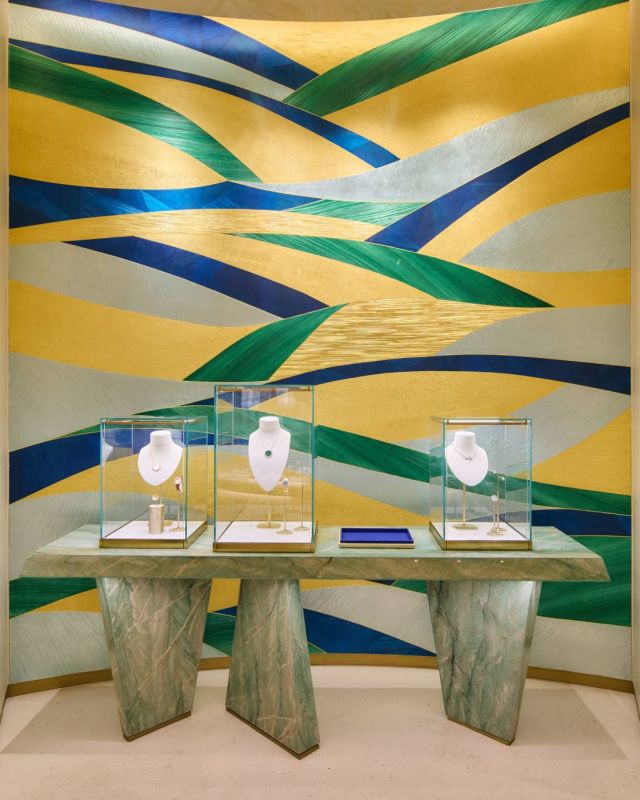 ويتميز المكان بواجهته المميزة التي تم تنسيقها بمهارة لناحية الأشكال والمساحات بين الأحجار الذهبية ونوافذها الزجاجية التي تشبه سوار الساعة الذي يكشف باستمرار عن تفاصيل جديدة ورائعة. وقد تم تنسيق المواد والألوان والتفاصيل المهمة التي يراها الزائرون عند دخولهم من الباب كلوحة جدارية فخمة مكونة من ألوان الأخضر والأزرق والذهبي. اللوحة الجدارية تكريماً للالتقاء الطبيعي بين الأنسجة والألوان وأحجار الزينة التي تمثل النجوم الحقيقية في عالم بياجيه.