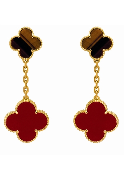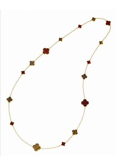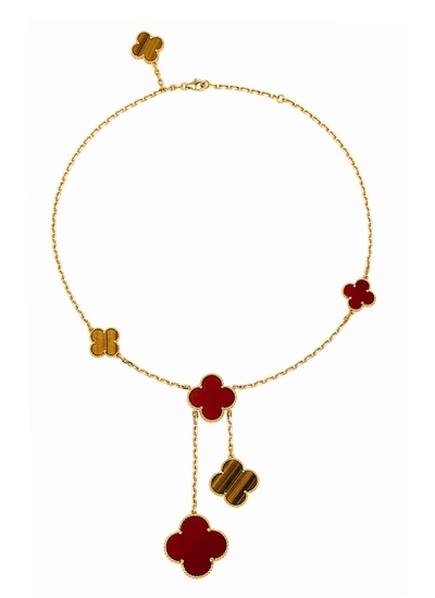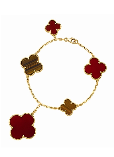 تقدم فان كليف أند أربلز Van Cleef & Arpels حجرين جديدين يضافان إلى شكل البرسيم الشهير ذي الأوراق الأربع ضمن مجموعة Magic Alhambra، هما عين النمر والعقيق الأحمر. في هذا التصميم الجديد، تمتزج الأعماق المتلألئة لأحدهما مع الدفء الأحمر القاني للحجر الآخر وتضاف اللمسات الأخيرة على هذا المزيج الأنيق بعظمة الذهب الأصفر. تمتزج هذه المواد الفاخرة في تصميم أربع قطع من المجوهرات فتمنحها درجات دافئة وحسية: قلادة طويلة، قلادة مع حلية متدلية، سوار وقرطان. تألّق رفيع مع بشرةٍ لوّحتها الشمس أو مع زيّ داكن اللون، تضفي مزيداً من المرح والحيوية.