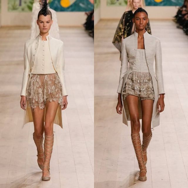 وتضمّنت المجموعة أيضاً تشكيلة واسعة ومتنوعة من التنانير القصيرة والطويلة المنتفخة مع تطريزات بارزة بالترتر والكريستالات المتلألئة، التي أضافت جمالية خاصة الى التصاميم. وبرزت في العرض أيضاً الأقمشة الشفّافة، مثل التول والدانتيل، التي أضفت لمسة من الأناقة والإبداع.