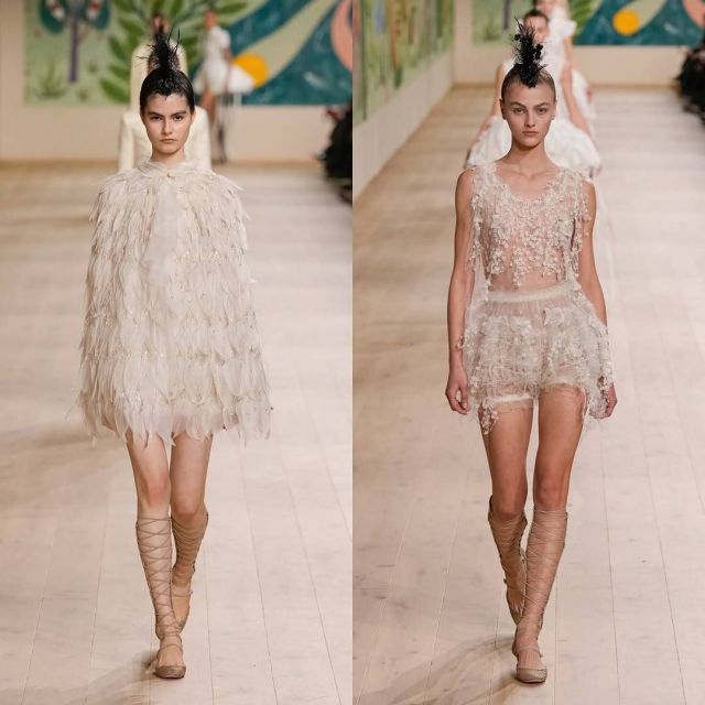 ارتدت العارضات فساتين قصيرة بكشاكش من الدانتيل والريش وشرائط الساتان المتطاير، إضافة الى تصميم La Cigale الأصلي للدار الذي برز أوائل الخمسينيات، من خلال قصّة الخصر الضيقة التي تُبرز الأنوثة. واعتمد على خط Trapeze الذي يمنح التصاميم المرونة والأناقة.