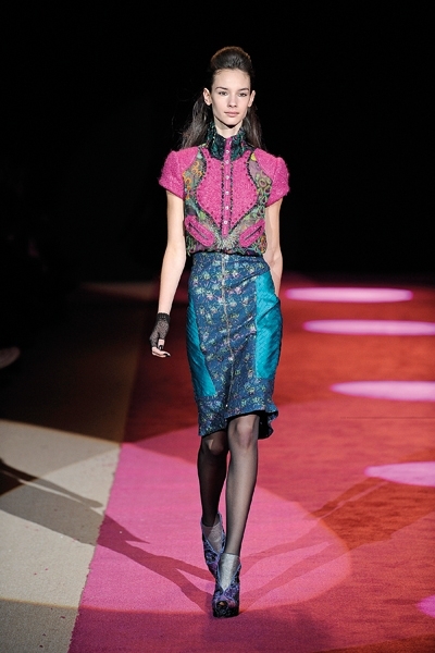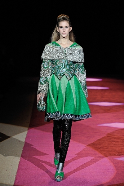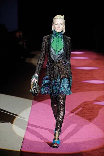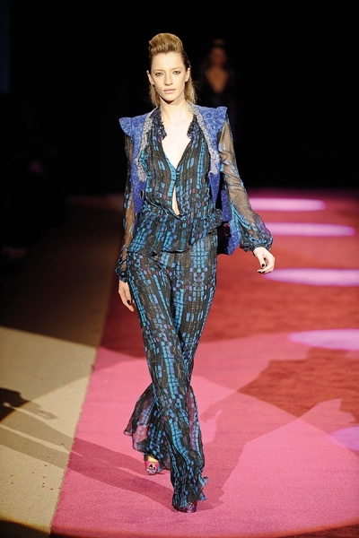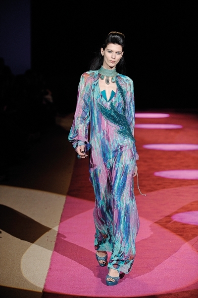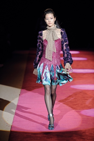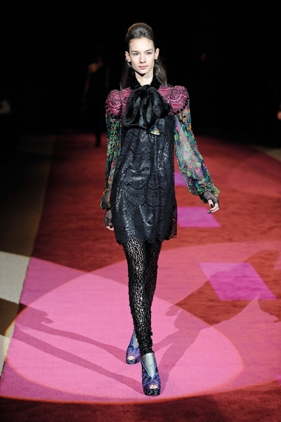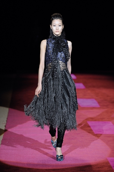مجموعة Custo مثل العادة صاخبة بالألوان والأقمشة المتعدّدة الملمس والرسوم الغرافيكيّة والدرزات الظاهرة، وقد ضمّت هذا الشتاء المعاطف بتصاميم مرحة وألوان الفوشيا والتوركواز، الفساتين طويلة ماكسي أو قصيرة جدّاً والسراويل ضيّقة مشكوكة بالخرز أو الباييت أو بقصّة «الشروال». كما أضاف كوستو الريش إلى التصاميم على الأكمام وأقمشة مطبوعة بجلود الحيوانات. وكعادته حافظ على الأبعاد الثلاثة فرأينا المرايا الصغيرة وحجارة باللون التوركوازيّ و«شراشيب» ووروداً من قماش كلّها معلّقة على الألبسة. والقمصان مربوطة عند العنق... المرح لم يغب عن العرض، فقد رأينا الجوارب مثلاً بتصاميم مختلفة على كلّ قدم، أو تصاميم الألبسة من الأمام مختلفة عن الخلف... والأحذية جميلة كما في كلّ عرض، أيضاً من تصميم Custo Barcelona. العمل اليدويّ واضح في المجموعة التي يريد أن يرسل كوستو عبرها رسالة للحفاظ على البيئة «بلغة الأناقة».