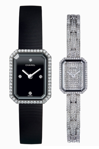 كل ساعات Première من شانيل Chanel تمتاز بعلبة مستطيلة مع سوار رفيع، لكن الموديلات تختلف لناحية الألوان وطريقة ترصيع الماسات ونوع السوار.