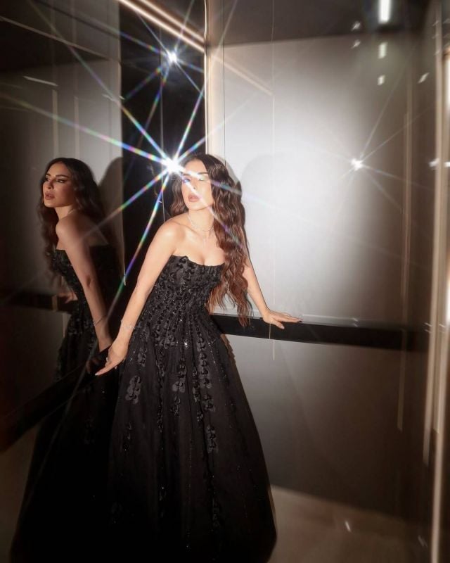 وأطلت الممثلة اللبنانية بكامل أناقتتها بفستان أنيق باللون الأسود حمل توقيع المصمم اللبناني سعيد قبيسي، تميّز بتصميمه الدراماتيكي الذي يجمع بين البساطة والتفاصيل التي تم إضافتها بطريقة فنية منحت الفستان إطلالة متكاملة بقصّة "أميرات ديزني" الجميلة. وجاء التصميم ضيق من الأعلى ومكشوف عند الأكتاف مع تطريزات باللون الأسود أضافت حركة وجمالية خاصة الى الفستان الذي انسدل من الأسفل بشكل تنورة واسعة بتطريزات ولآلئ منحته المزيد من الفخامة والأناقة.