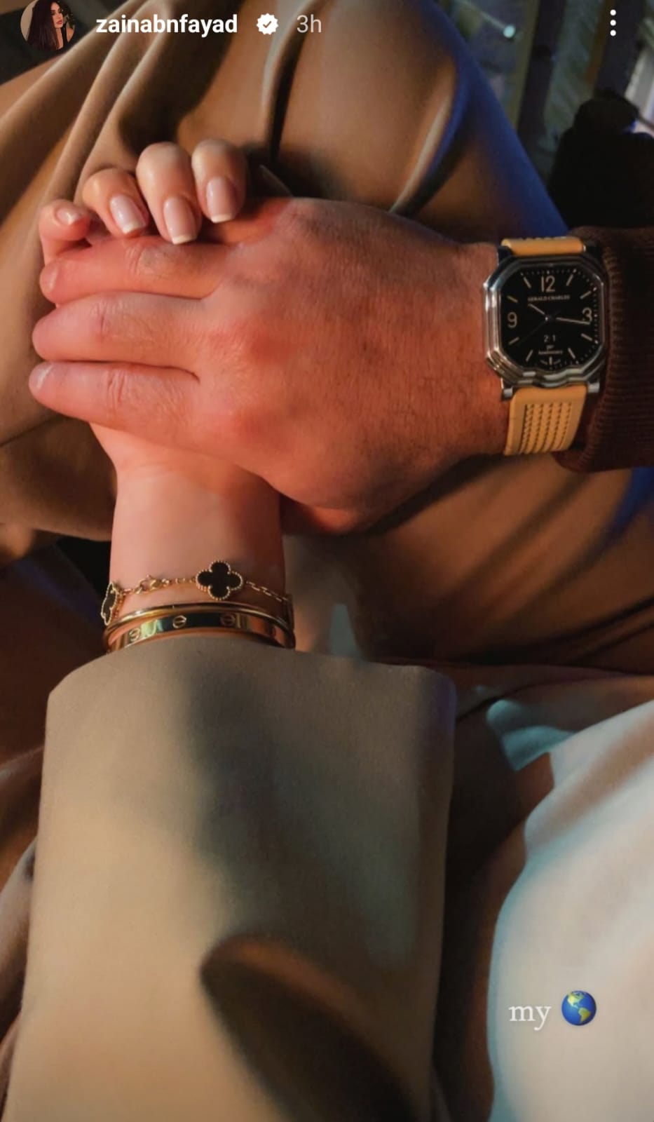 وتظهر في الصورة يد زينب وهي تحتضن يد خطيبها الذي وصفته بعبارة "عالمي"، في إشارة الى حبهما الكبير وعلاقتهما المبنية على الحب والاحترام. وتحرص زينب على الاهتمام بإطلالاتها واختيار أجدد التصاميم من أهم الماركات العالمية، وابتعدت قبل فترة عن نشر فيديوهات وصور تجمعها بابنتيها.