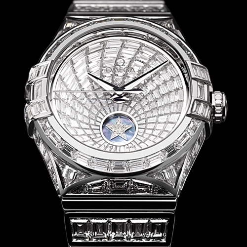 تعتبر ساعة Constellation Baguette الفخمة والفريدة من أوميغا Omega النجمة الأكثر سطوعاً وبهاءً في مجموعة ساعات Constellation. فهذه الساعة الماسية الرائعة تتلألأ بنحو ٤٥٩ ماسة يصل مجموعها إلى أكثر من ٣٠ قيراطاً. والتركيب «الخفي» لـ١٤٦ ماسة طويلة ومنحرفة في الميناء يضمن عدم ظهور أي أثر للذهب الأبيض بعيار ١٨ قيراطاً المستخدم في ابتكار علبة الساعة.