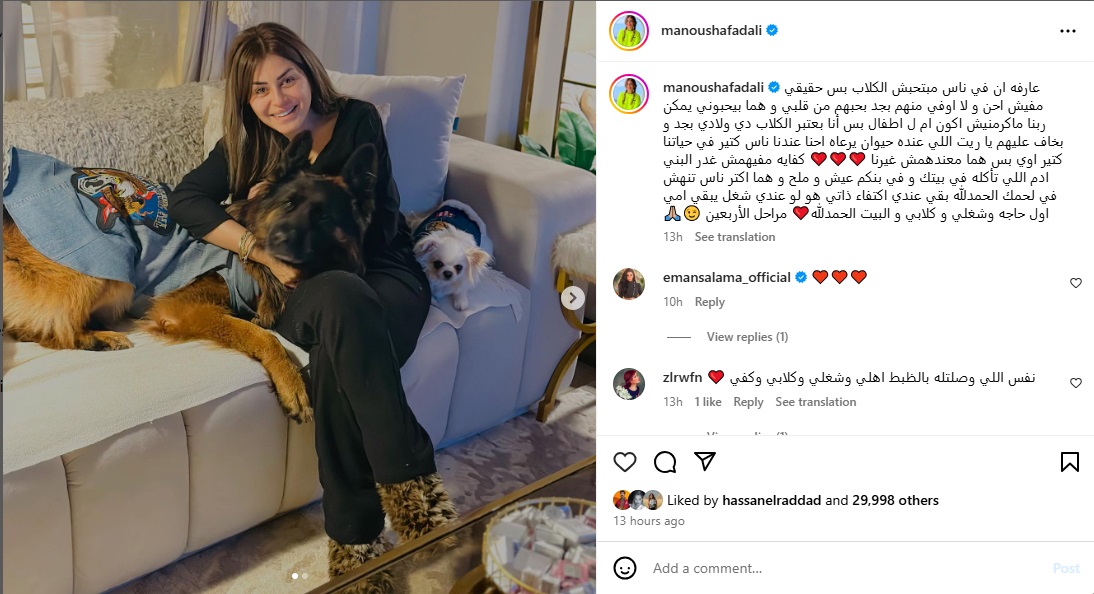 نشرت منة عبر حسابها الرسمي في "إنستغرام"، مجموعة من الصور لها برفقة كلابها وعلقت عليها برسالة طويلة قالت فيها: "عارفة إن في ناس مبتحبش الكلاب، بس حقيقي مفيش أحن ولا أوفى منهم. بحبهم من قلبي، وهما بيحبوني. يمكن ربنا ما كرمنيش أكون أم لأطفال، لكن أنا بعتبر الكلاب دي ولادي بجد، وبخاف عليهم".
