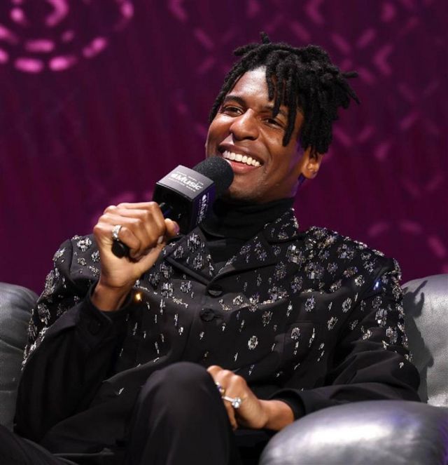 ارتدى الموسيقي جون باتيست تصميماً أنيقاً من "فيرساتشي". وتألق خلال الحفل بسترة من الصوف الأسود مع تطريز من الكريستال والجواهر، وجاء بتصميم الياقة العالية المتماسكة وسروال من الصوف من مجموعة خريف وشتاء 2024.