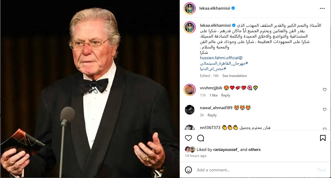 وعلّقت لقاء على صورة حسين فهمي قائلةً: "الأستاذ والنجم الكبير والقدير المثقف المهذب الذي يقدّر الفن والفنانين ويحترم الجميع مهما كان قدرهم، شكراً على المصداقية والتواضع والأخلاق الحميدة والكلمة الصادقة الجميلة، شكراً على المجهودات العظيمة، شكراً على وجودك في عالم الفن والمحبة والسلام، شكراً".