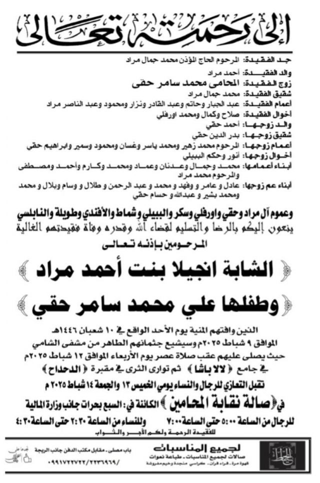 أعلنت أسرة الممثلة السورية أنجي مراد موعد ومكان تشييع جثمانها اليوم (الأربعاء) ومراسم عزائها، من مستشفى الشامي في العاصمة دمشق، إلى جامع "لا لا باشا" حيث يُصلّى على جثمانها، قبل دفنها في مقابر "الدحداح"، ثم تلقي العزاء في صالة نقابة المحامين.