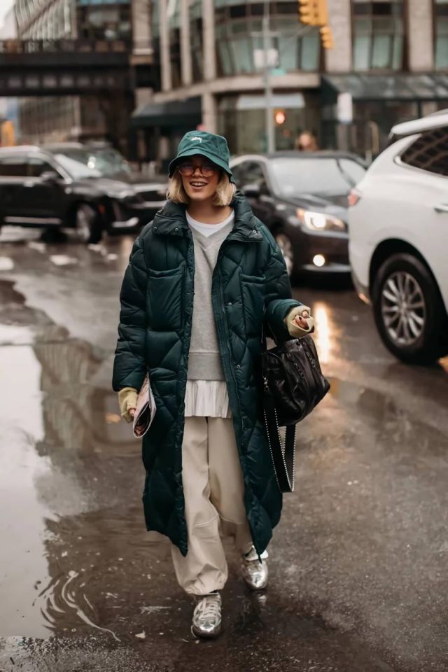 في حين تتمتع المعاطف المنتفخة غالباً بسمعة غير رسمية، فإن هذه الطبقة المبطّنة الموضحة أعلاه تبدو مرتفعة بلا شك. للحفاظ على الدفء والأناقة، ارتدي خياراً مشابهاً مع سترة دافئة وبنطلون مظلّة يوفر الكثير من التغطية.