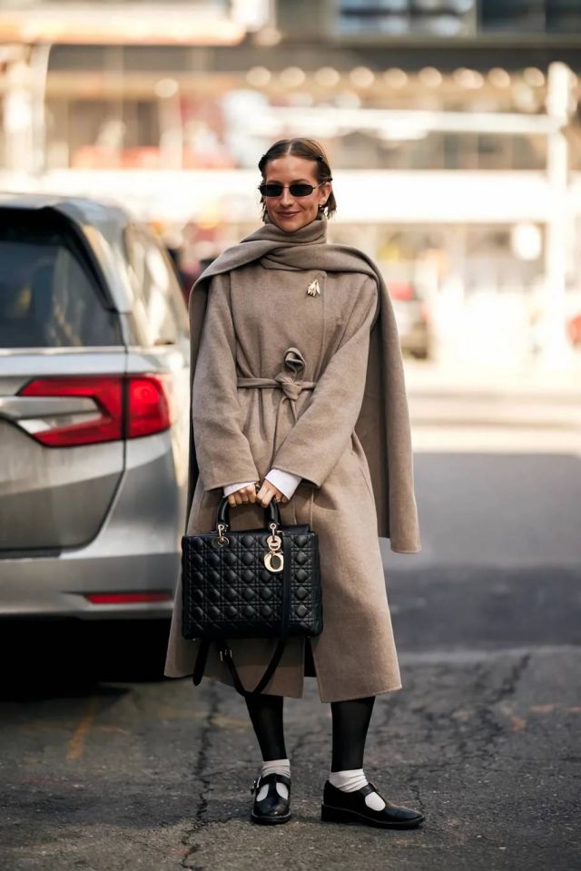 إذا كنت تتساءلين عن كيفية تنسيق زي أنيق، فإن هذه الإطلالة لديها كل الإجابات. بصرف النظر عن المعطف المزيّن بدبوس، فإن الأحذية الجلدية ذات الحزام على شكل الحرف T وحقيبة اليد المصمّمة بخياطة مثالية هي التي تضفي على هذا المظهر لمسة من الرقي.