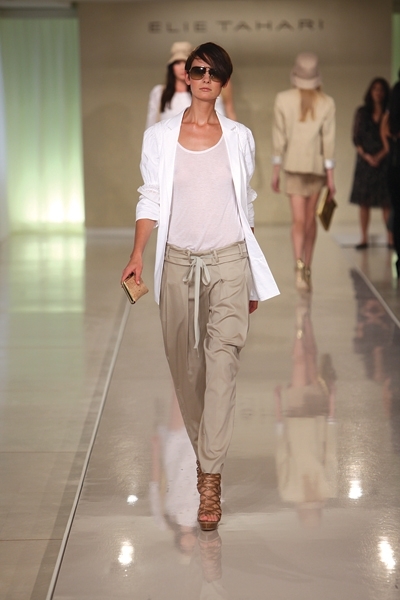 لمجموعة الربيع والصيف قدّم Elie Tahari تصاميم بألوان البيج والأبيض، مع لمسات من الذهبيّ والفضيّ والبرتقاليّ الذي رأيناه حتّى في تصاميم للرجال.