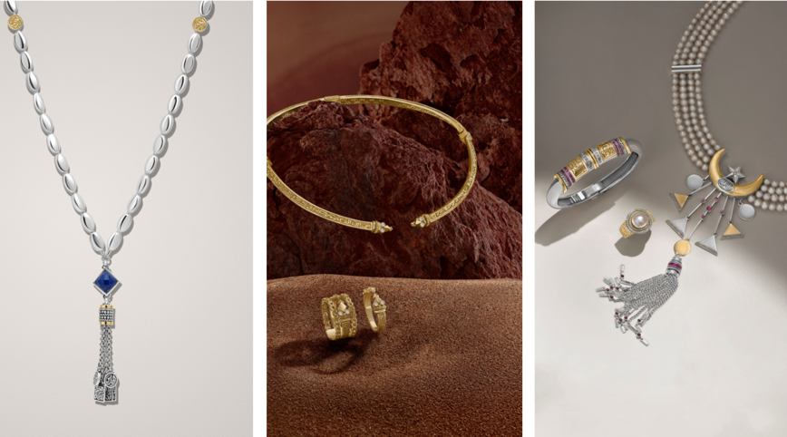 ﺗﺗﺄﻟّق ﻣﺟﻣوﻋﺔ رﻣﺿﺎن ﺑﻘﻼدة اﻟﺧط اﻟﻌرﺑﻲ Choker Calligraphy Tribal، اﻟذي ﯾﺣﻣل ﻧﻘوﺷﺎً ﺧطّﯾﺔ ﺗﻌﺑّر ﻋن اﻟﺣبّ والفرح، إلى جانب أقراط وخواتم مستوحاة ﻣن اﻟﻔنّ اﻟﻌﺛﻣﺎﻧﻲ، ﺗزﯾّﻧﮭﺎ زﺧﺎرف اﻟﮭﻼل واﻟﻧﺟوم اﻟﻣزﯾﻧﺔ ﺑﺎﻟﻣﺎس واﻟﯾﺎﻗوت واﻟزﻣرّد، واﻟﺗﻲ ﺗرﻣز إﻟﻰ اﻟﺟﻣﺎل واﻟﺗوازن.