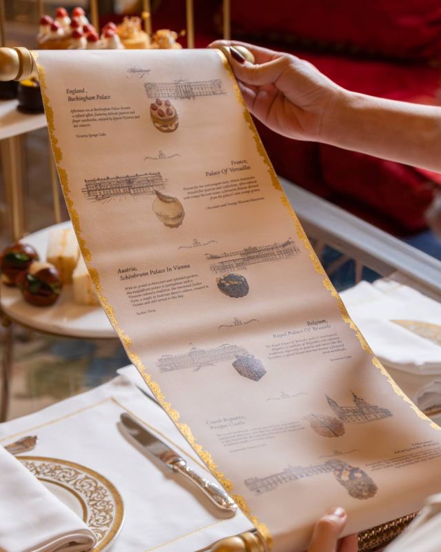 ومما يزيد من روعة هذه التجربة، الفكر الدقيق والعناية المضمنة في كل التفاصيل. يتم الترحيب بالضيوف برسالة مكتوبة بخط اليد ومزيّنة بالذهب من جانب الشيف جيمس، حيث يروي الرحلة الطهوية التي سيشرعون فيها، مصحوبة بمخطوطة ملكية تحتوي على رسومات لكل قصر ومعجّناته، والتي تأخذ الضيوف في رحلة بصرية من العظمة الأوروبية. بدءاً من الطقوس البريطانية الجوهرية المستوحاة من عظمة قصر باكنغهام، سيستمتع الضيوف بالنكهات الرقيقة لشطائر الخيار وكعكة الإسفنج فيكتوريا الخالدة، المفضّلة لدى الملكة فيكتوريا نفسها. تستمر الرحلة إلى قصر فرساي الفخم، حيث يتم التعامل مع الزوّار بالنكهات الفخمة المستوحاة من أسلوب حياة ماري أنطوانيت الباذخ، المتجسّد في حلوى الماكارون الرائعة بزهر البرتقال.