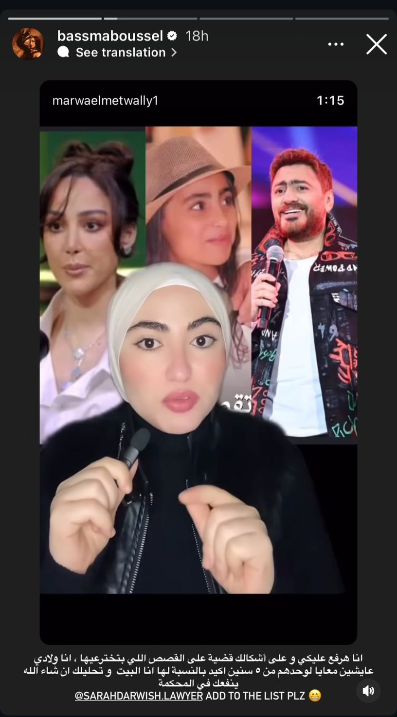 وأعادت بسمة بوسيل نشر الفيديو عبر حسابها الخاص على "إنستغرام" وعلقت عليه بقولها: "هرفع قضية عليكي عشان القصص اللي بتخترعيها، أنا ولادي عايشين معايا لوحدهم من خمس سنين أكيد بالنسبة لبنتي أنا البيت، وتحليلك إن شاء الله هينفعك في المحكمة".