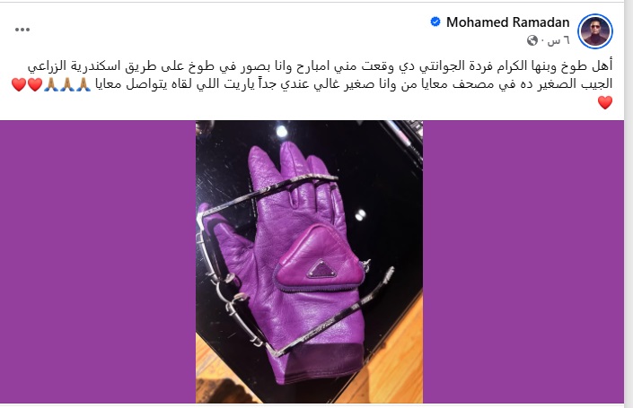 وكتب رمضان معلقاً على الصورة: "أهل طوخ وبنها الكرام فردة الجوانتي دي وقعت مني إمبارح وأنا بصوّر في طوخ على طريق إسكندرية الزراعي الجيب الصغير ده في مصحف معايا من وأنا صغير غالي عندي جداً ياريت اللي لقاه يتواصل معايا".